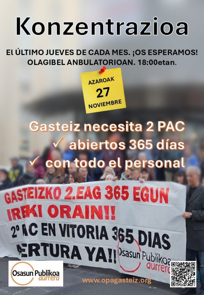 Onartezina da egun hauetan bete gabeko promesekin jarraitzea; horregatik, kalera aterako gara Gasteizko bigarren EAG berehala irekitzeko exijituz, giza baliabide nahikoekin eta ohiko EAG ordutegiekin, herritarrei osasun-arreta egokia bermatzeko eta Txagorritxuko Larrialdi Zerbitzuak kronikoki jasaten duen gainkarga arintzeko.